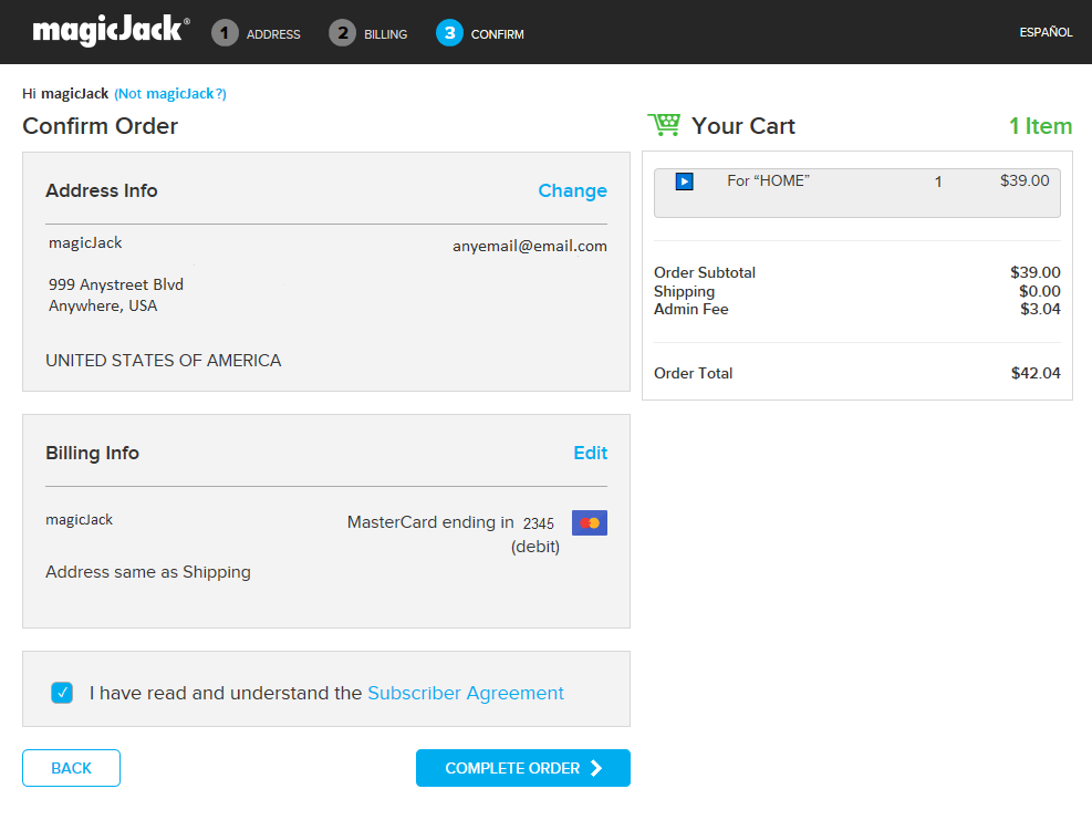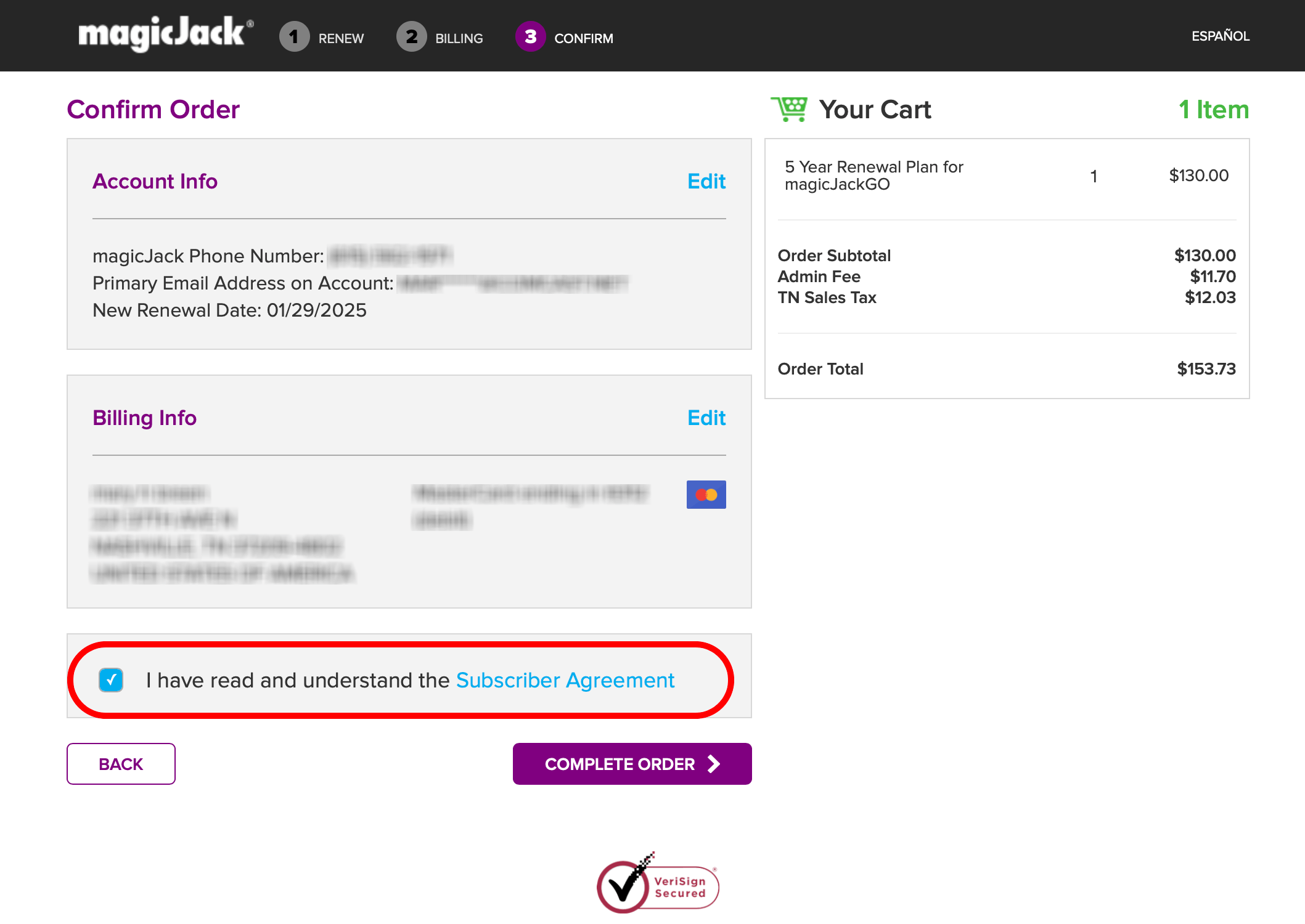 - Review the magicJack Subscriber Agreement, select the checkbox then click COMPLETE ORDER